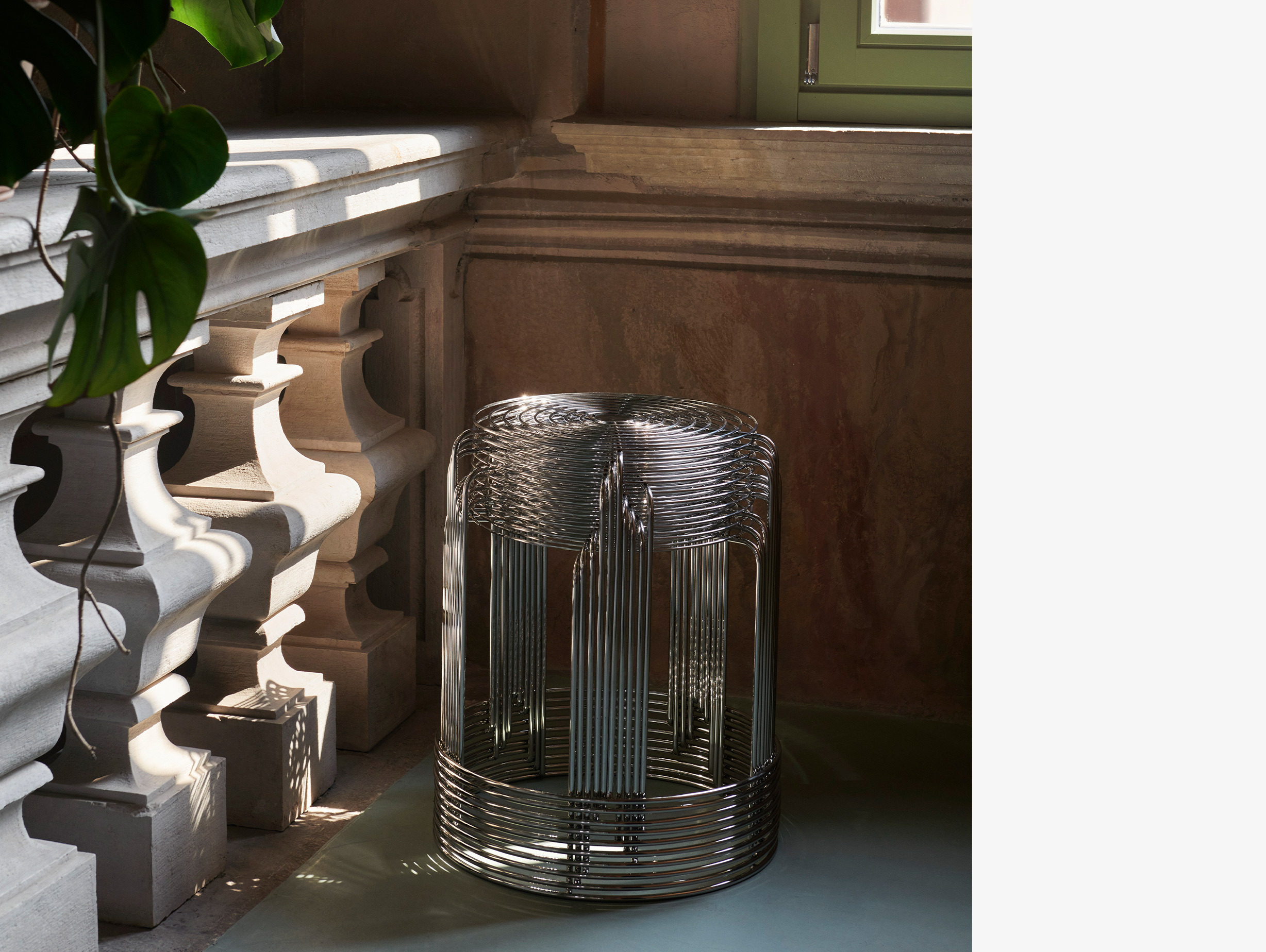 The stool is made from a stainless steel wire frame, precisely bent into circular forms and spot welded for stability with a mirror polished finish. A magnetic steel centre plate allows easy attachment of the seat pad.