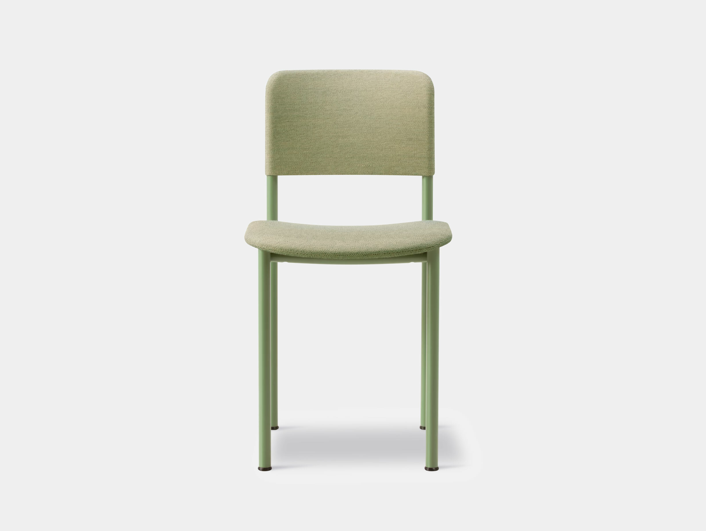 Fully upholstered, the chair's frame comes in tubular steel, powder coated or brushed steel. Backrest with moulded foam and inner seat in plywood with CMHR or HR foam covered in fabric or leather.