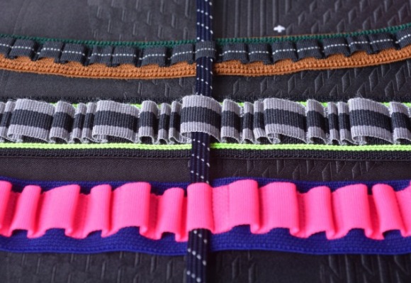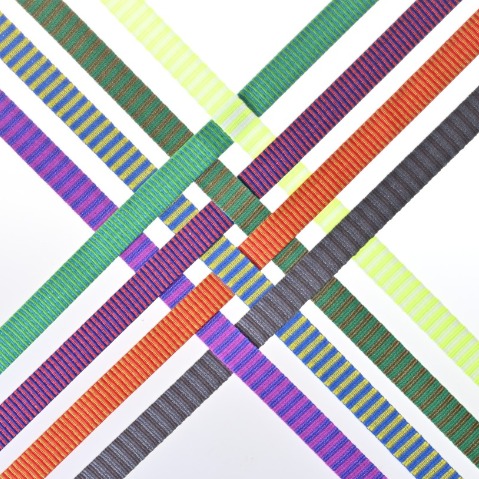 - 百和織帶採用高品質前染紗線,從 75D 到 600D 紗線可選用,亦可採用多樣紗種如尼龍 Woolly 紗、亮光紗、反光紗等,不論是配色組合、質感紋路、外觀效果皆豐富多樣變化。