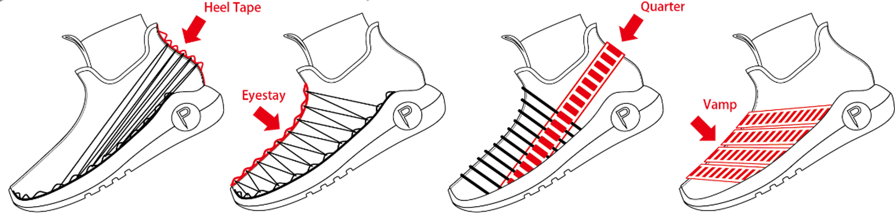 - 可於鞋面局部使用不同類型織帶以符合設計與機能需求。