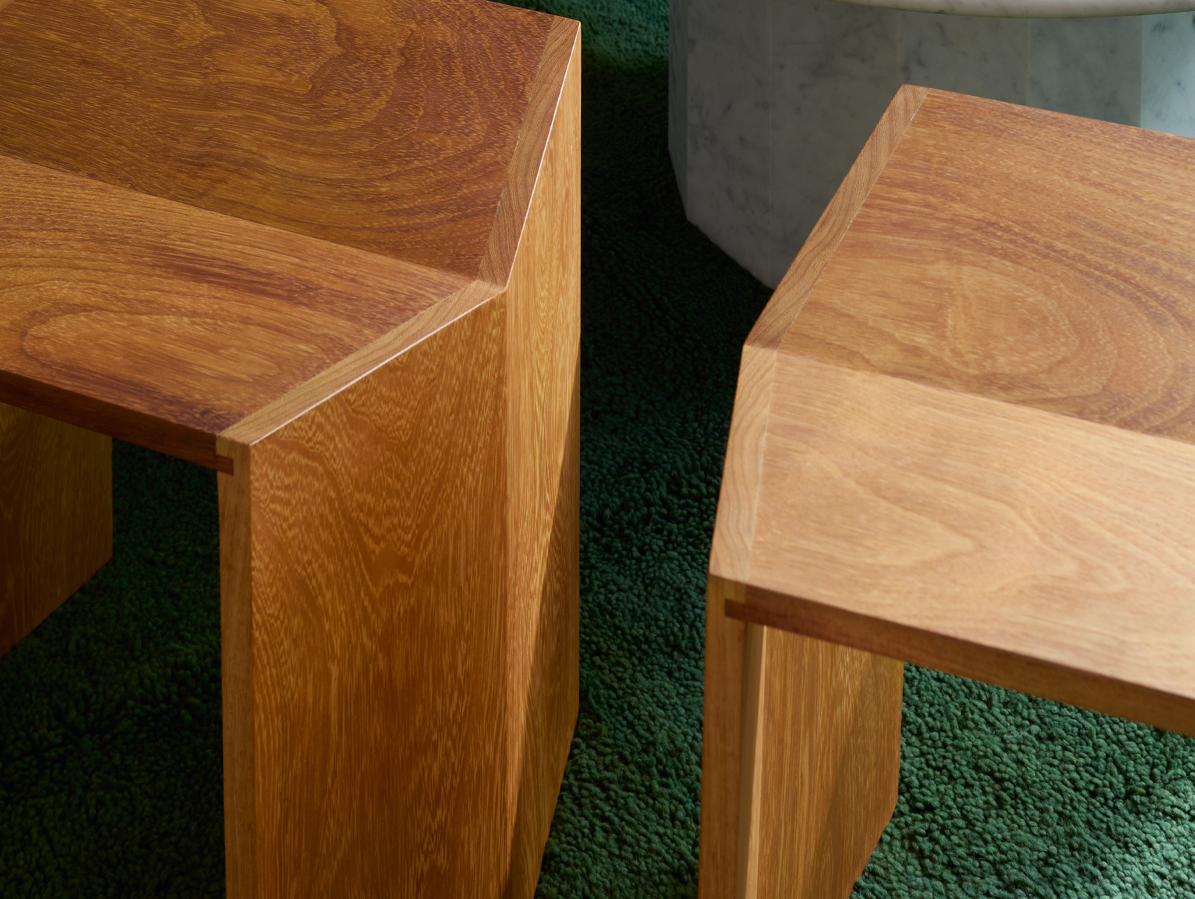 A geometric stool crafted from solid Iroko wood from the west coast of Africa